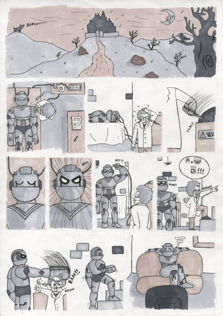Pour la planche de BD avec le robot, nous n'avons été autorisés à utiliser que trois couleurs, ce qui a ajouté un défi intéressant. J’ai eu beaucoup de plaisir à travailler sur ces illustrations!