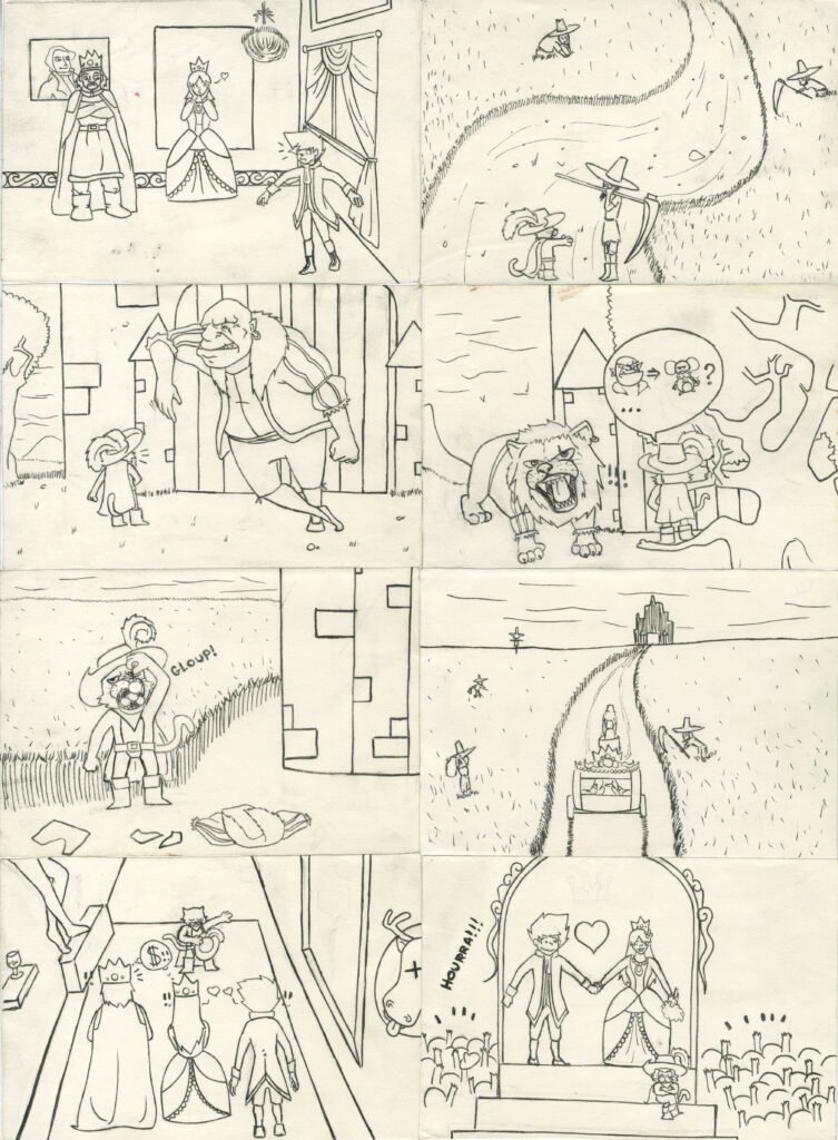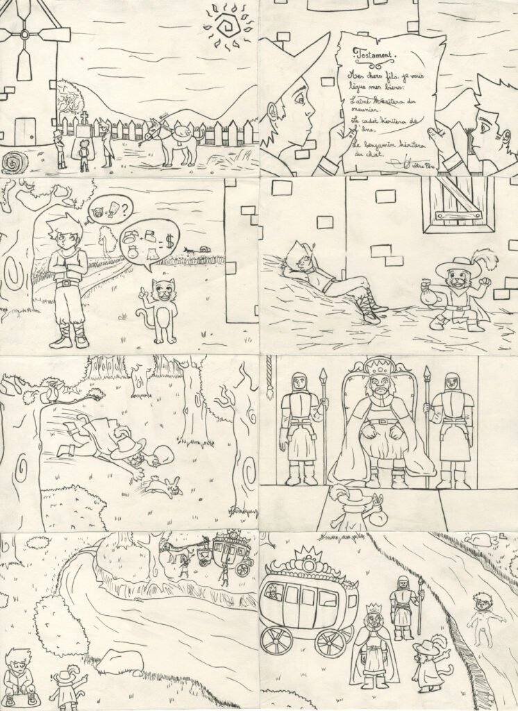 Pour la deuxième illustration, on m'a assigné l'histoire du "Chat Botté" à représenter en quelques pages. Heureusement, j'avais lu l'histoire d'innombrables fois quand j'étais petit! 🙂